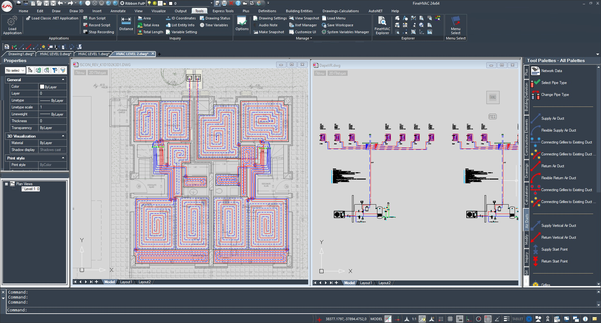 The new GUI interface is closer to the AutoCAD look-and-feel, with the capability to display the ribbon and menu bar simultaneously. Enhanced by the new tool palettes, it is significantly faster in both the display engine itself, with even faster zoom and pan operations, and in reading/writing and opening/saving project files. With this new design, the AutoBLD and AutoNET group of commands, including new and enhanced dialogs, are now three times faster than the ones in FINE19. Even the project supervision is much higher due to the display of the underlying and superimposed floor outlines.