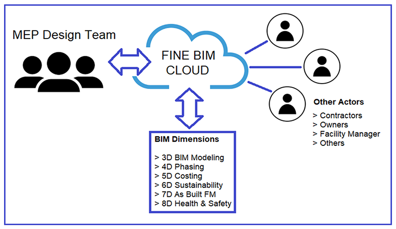 As mentioned above, FINE-CLOUD provides its users with a high degree of flexibility in choosing among several work environment options, constituting at the same time a powerful collaborative environment of high synergy among designers themselves and also third parties (i.e., project owner, contractor, facility manager, etc.). Besides, FINE-CLOUD (a stand-alone version or in conjunction with other 4M BIM apps) covers all the eight BIM dimensions: intelligent 3D building modeling (3D BIM), construction scheduling and phasing (4D BIM), costing and budgeting (5D BIM), sustainability (6D BIM), facility management (7D BIM) and health and safety (8D BIM).